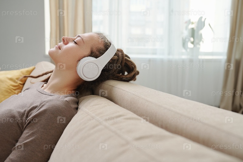 Молодая спокойная женщина с наушниками, наслаждающаяся музыкой для отдыха на диване