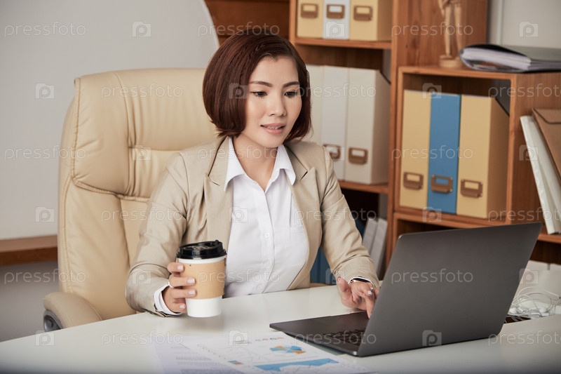 Красивая бизнесвуменка пьет кофе и работает на ноутбуке