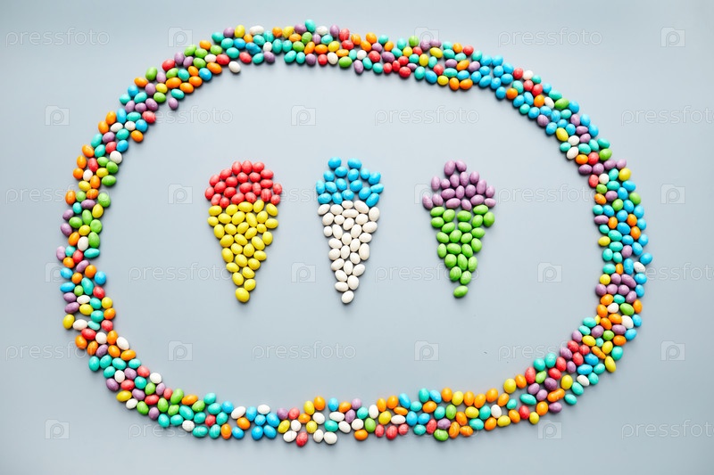 Красочные желе, выложенные в форме трех мороженого внутри овальной рамы