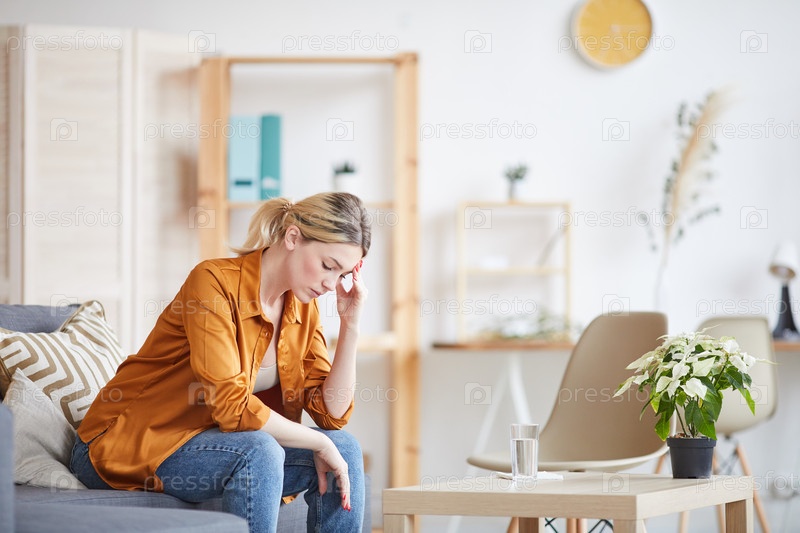 Удивленная молодая женщина с конским хвостом сидит на диване и опирается головой на руку, чувствуя головную боль, она сидит в кабинете психолога