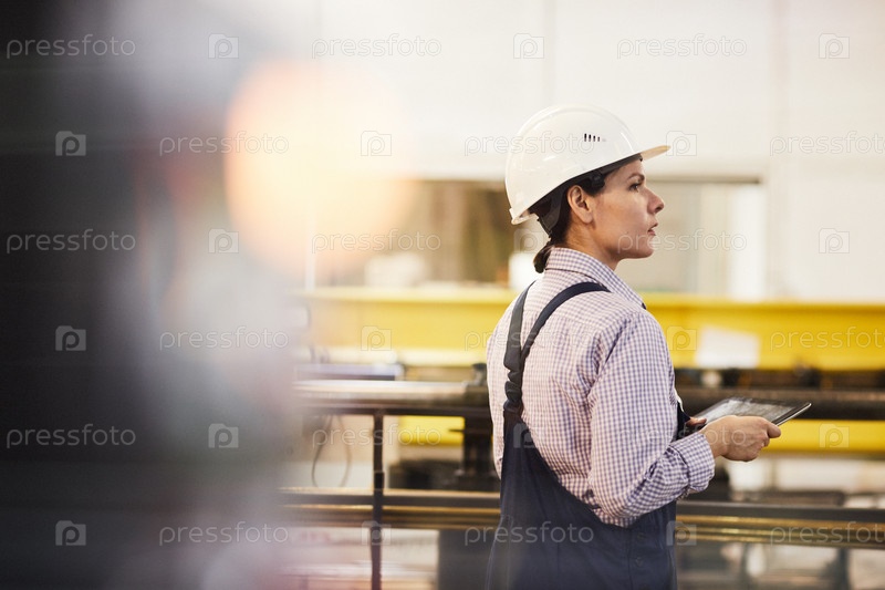 Задний вид серьезной женщины-работницы сборочной линии в хардхете, стоящей у конвейера и контролирующей движение произведенных деталей