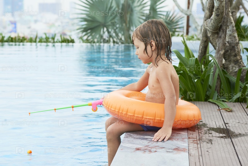 Мальчик рыбачит у бассейна