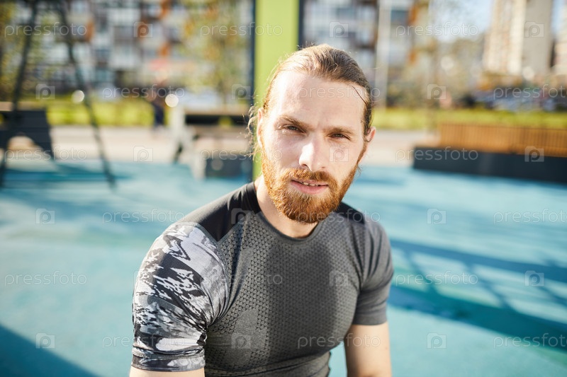 Краснобразный мужчина в спортивной футболке