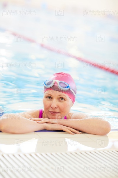 Зрелая женщина позирует в бассейне