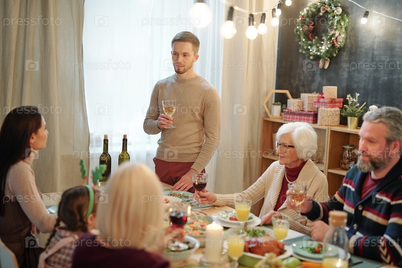 Молодой человек с бокалом вина делает тост у обеденного стола перед своей семьей