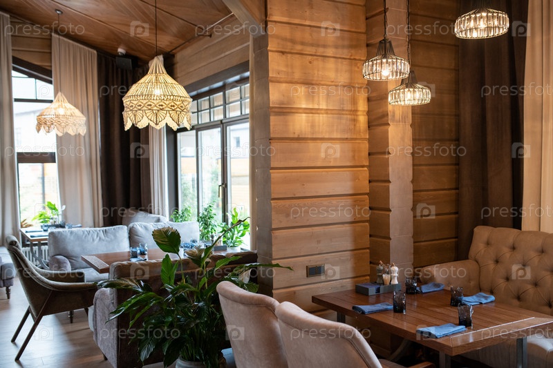 Уголок современного роскошного ресторана с деревянными столами, подаваемыми для гостей