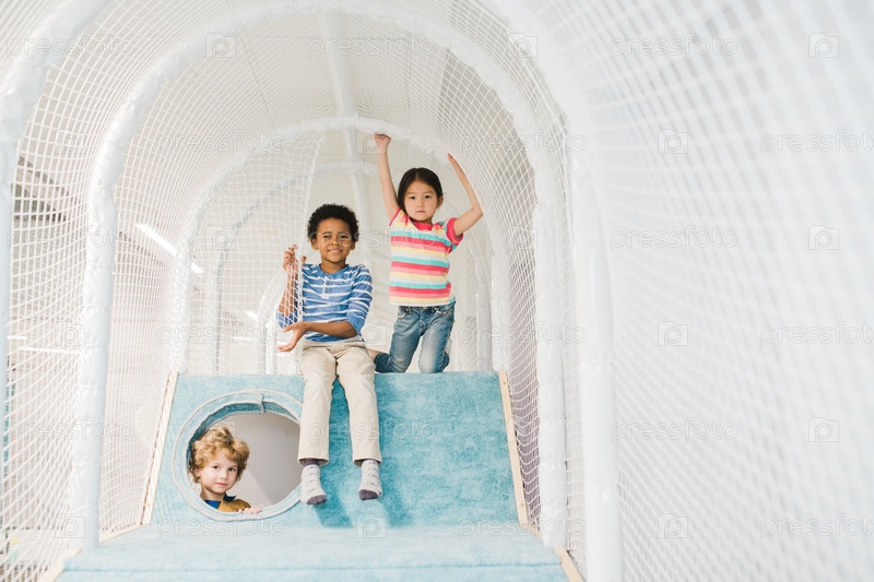 Группа из трех очаровательных детей разных этнических групп, играющих в центре отдыха