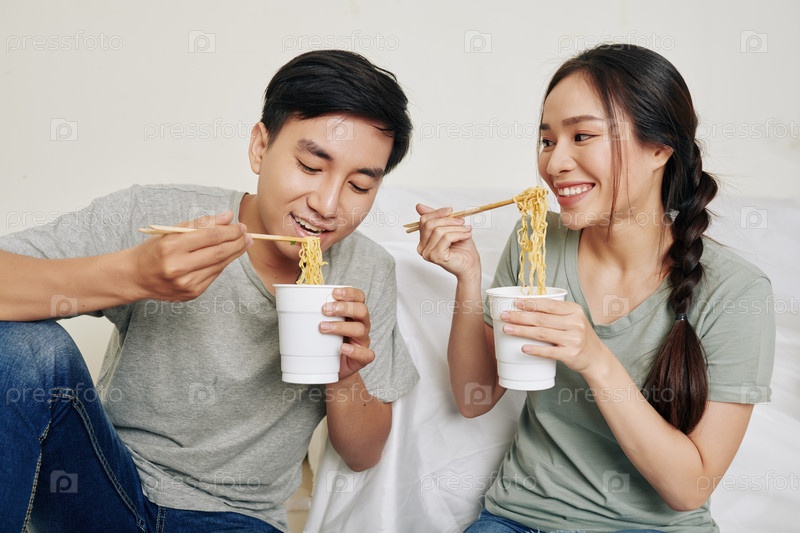 Молодая пара ест рамены