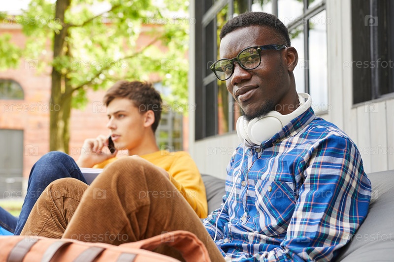 Афроамериканский студент отдыхает на свежем воздухе