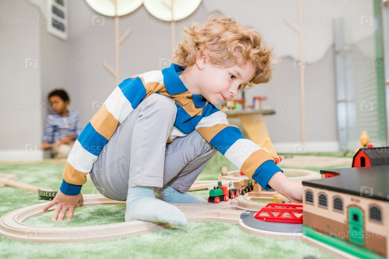 Милый блондинский мальчик в повседневной одежде играет на полу в детском саду
