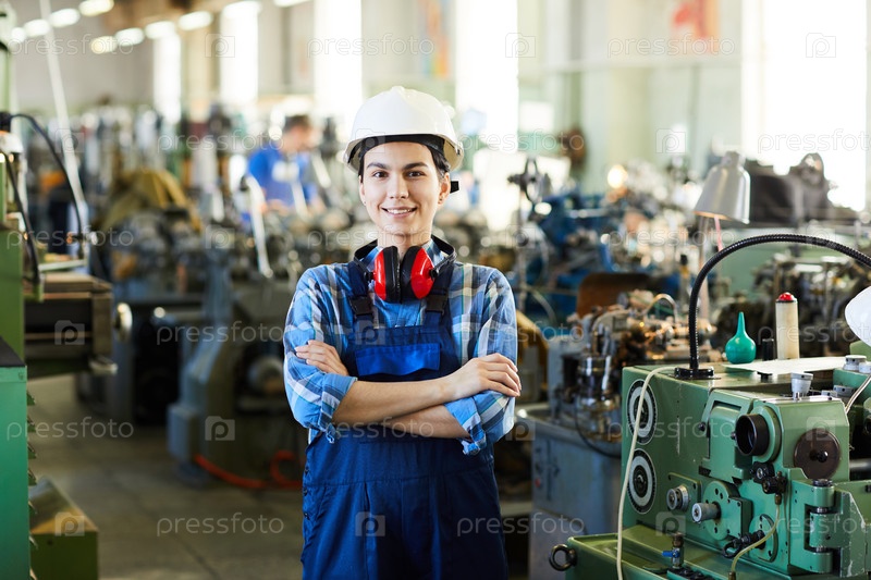 Счастливая привлекательная молодая леди-работница в общей сложности стоит против промышленных машин и улыбается перед камерой