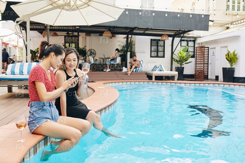 Друзья-женщины со смартфоном сидят у бассейна