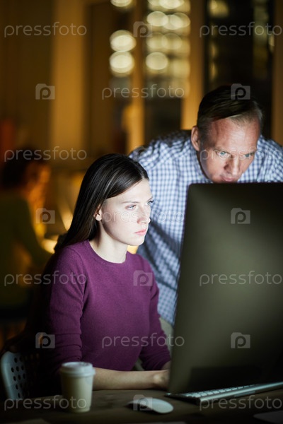 Серьезные мыслящие коллеги в обычной одежде внимательно смотрят на компьютерный монитор, анализируя данные в темном офисе