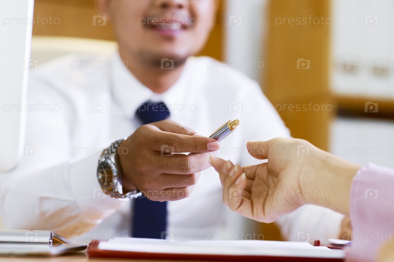 Бизнесмен отдает ручку клиенту