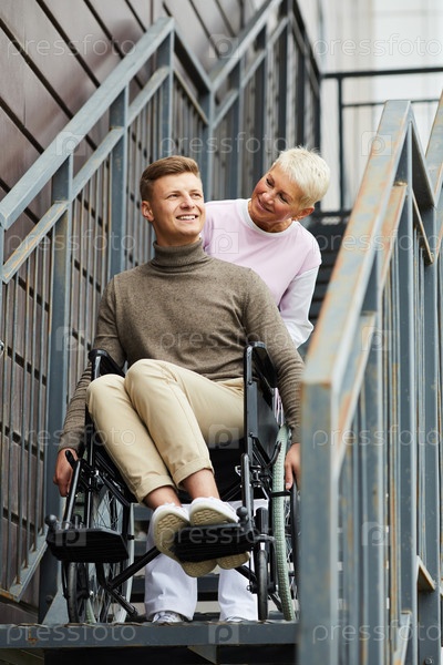Содержание осторожной зрелой медсестры с светлыми волосами, помогающей калеку в инвалидном кресле сойти по лестнице на улице
