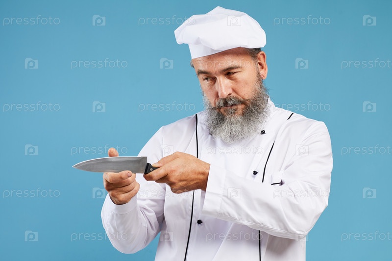 Бородатый шеф-повар держит острый нож на синем