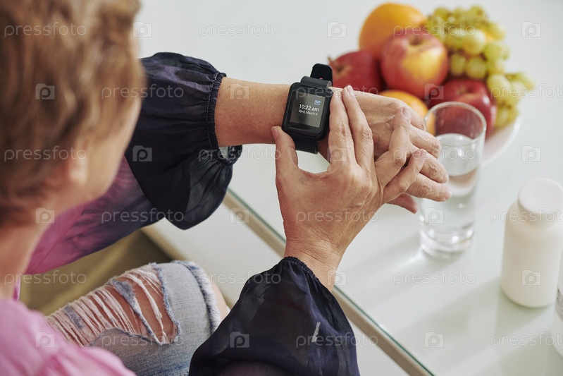 Пожилая женщина проверяет умные часы