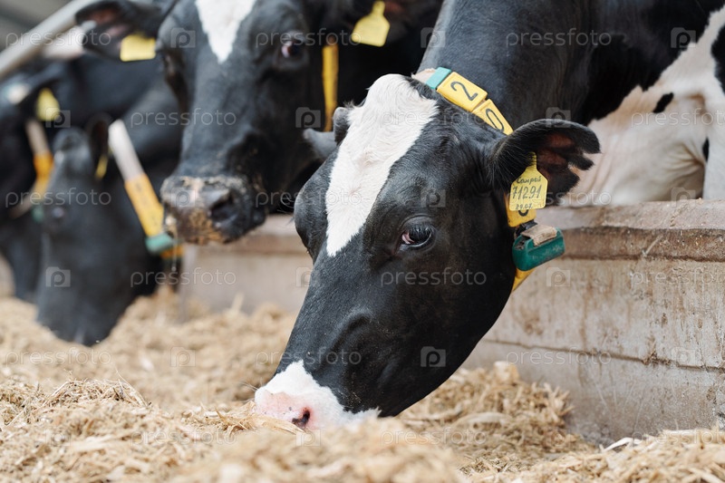 Группа черно-белых молочных коров ест свежее сена, стоя в очереди