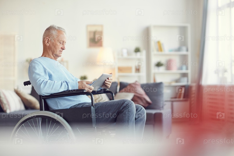 Серьезный сконцентрированный пожилой мужчина сидит в инвалидной коляске и использует современное приложение на планшете в гостиной