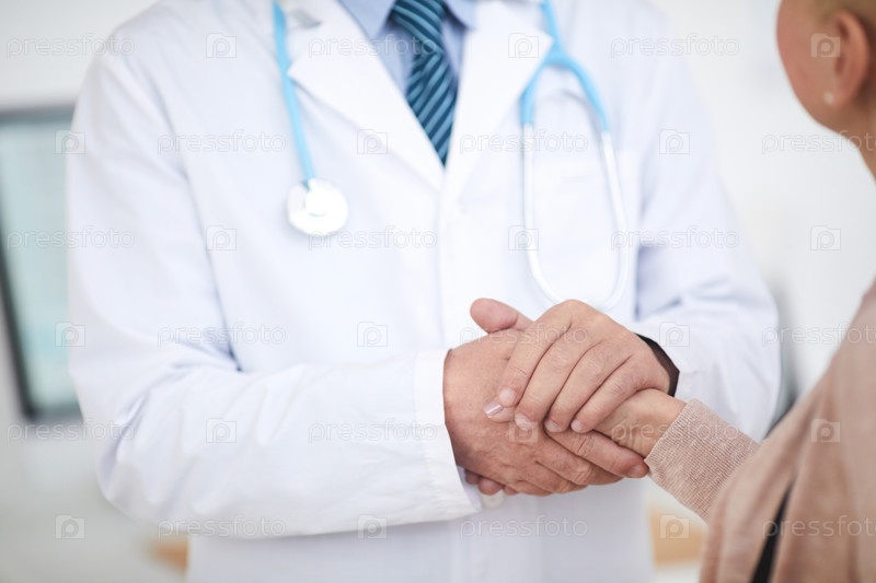 Близкий план неузнаваемого врача-мужчины в лабораторном халате, стоящего и держащего руку пациентки, поддерживая ее
