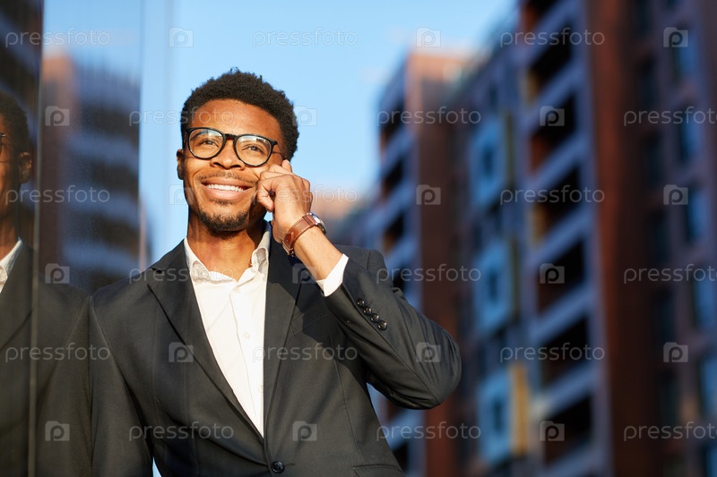 Веселый молодой чернокожий бизнесмен в костюме стоит возле современного здания и разговаривает по телефону