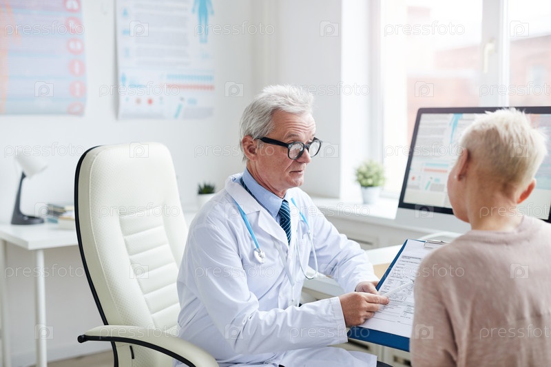 Серьезный пожилой врач в лабораторном пальто и очках сидит за столом с компьютером и просит пациента заполнить форму