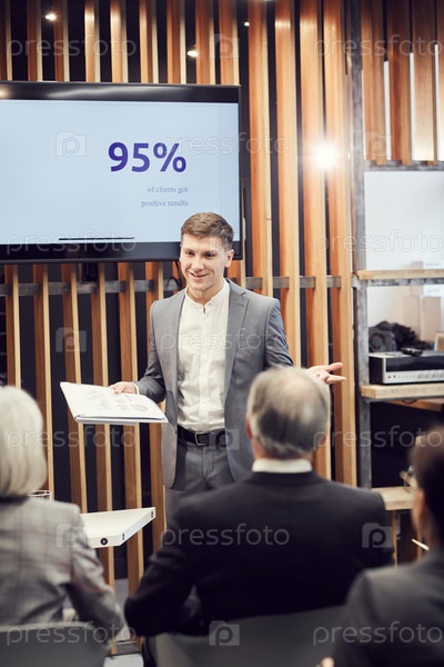 Улыбающийся уверенный молодой бизнесмен в костюме стоит перед аудиторией и представляет успешные маркетинговые кейсы на деловой конференции