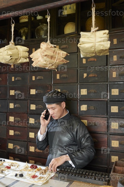 Зрелый азиатский мужчина упаковывает заказ в аптеке