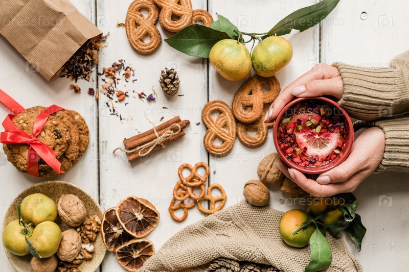 Вид женских рук, держащих кружку с горячим напитком и рождественской едой вокруг