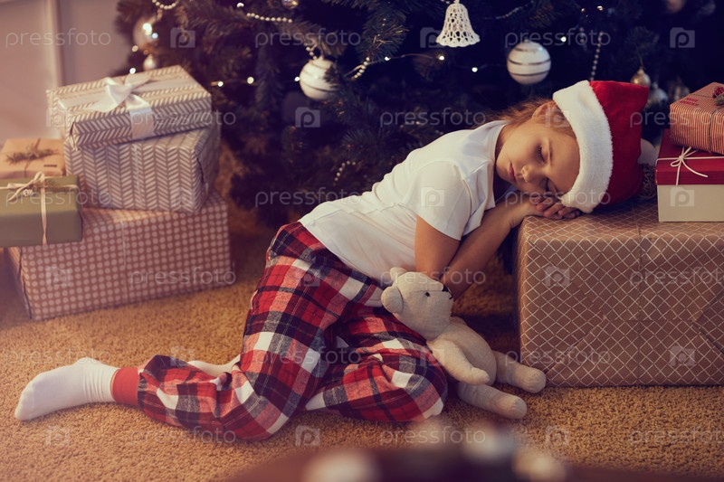 Красивая девушка в удобной пижаме и шляпе Санты сидит на ковре и спит на подарочном ящике возле елки, ожидая Рождества