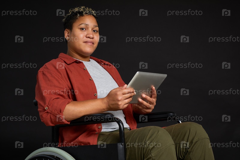 Инвалидная женщина, использующая планшетный компьютер
