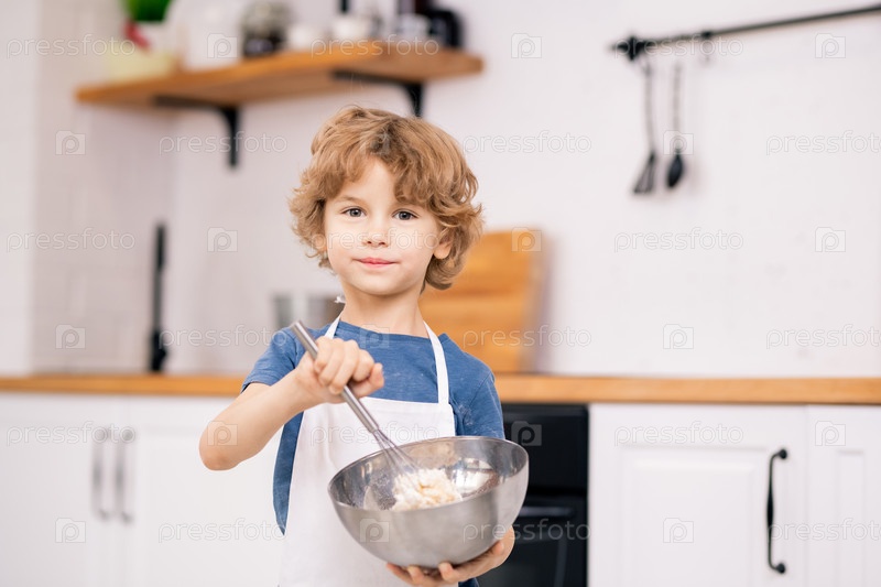 Милый блондин использует усы, смешивая муку и яйца в стальной таре