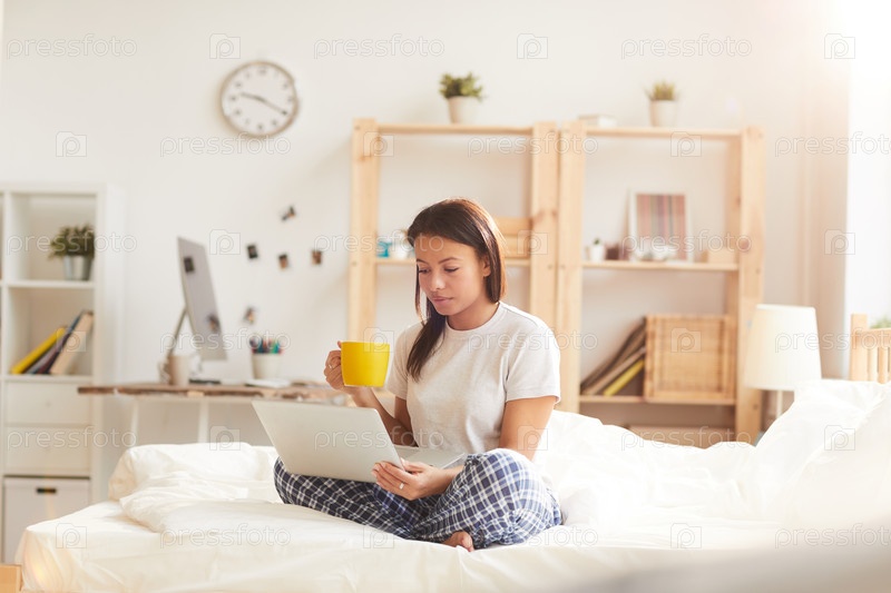 Молодая женщина, использующая ноутбук в постели