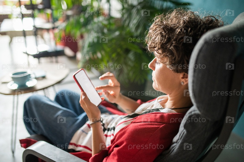 Молодая спокойная женщина, сидящая в кресле у стола и отправляющая сообщения на смартфоне