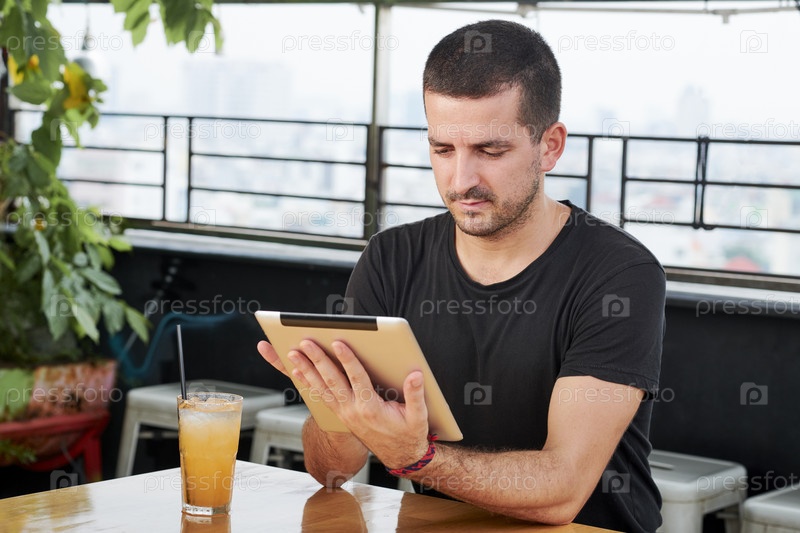 Мужчина, использующий планшетный компьютер в кафе