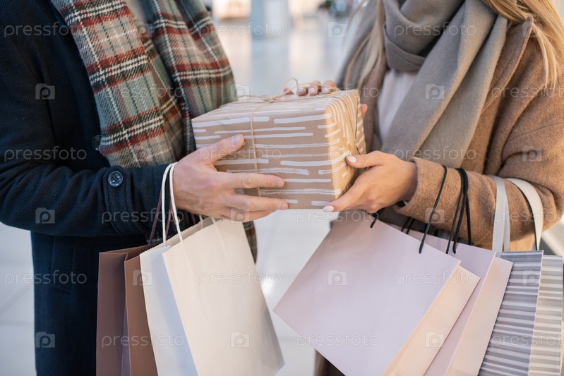 Средняя часть молодой случайной пары, держащей бумажные мешки и упакованную коробку с подарками