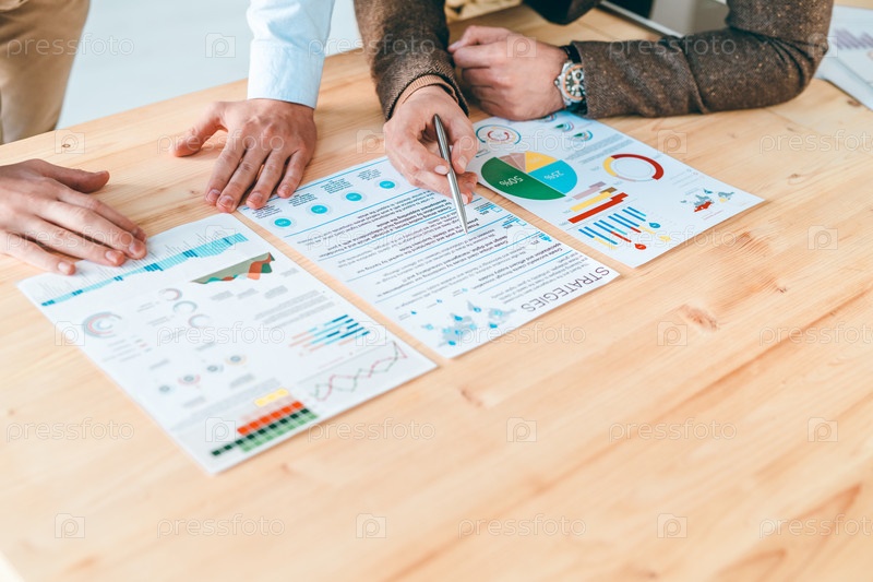 Молодой экономист указывает на финансовую информацию, обсуждая стратегии