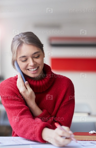 Позитивная привлекательная женщина-менеджер в стильном свитере, сидящая за столом в офисе и обсуждающая UX дизайн с клиентом по телефону