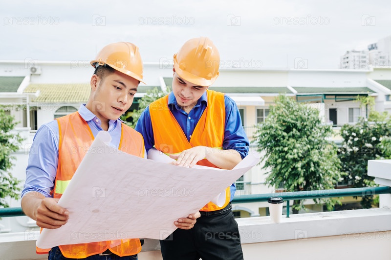 Инженер и подрядчик обсуждают план работы