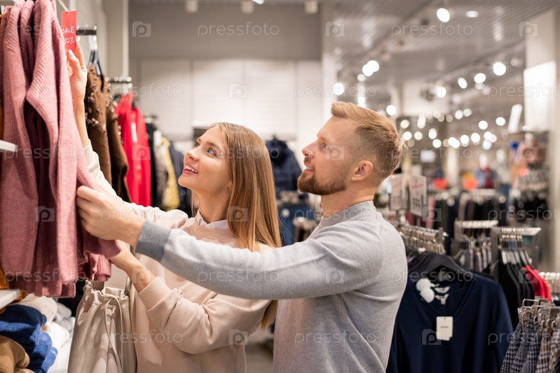 Молодая пара в повседневной одежде смотрит на новую сезонную коллекцию одежды