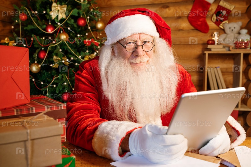 Улыбающийся Санта-Клаус с белой бородой серфирует в сети за рождественскими подарками