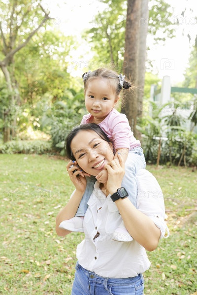 Веселая мать и дочь проводят летний день в парке
