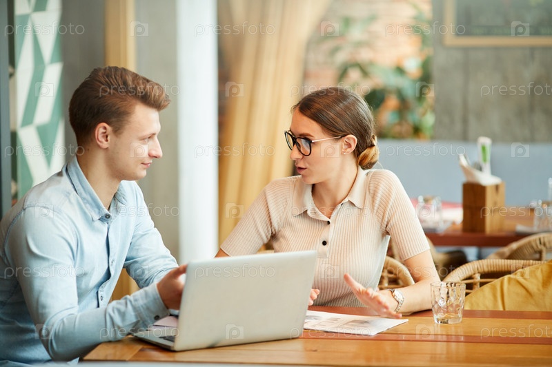 Задумчивые молодые креативные маркетологи сидят за столом в кафе и работают с бумагами, обсуждая онлайн-проект