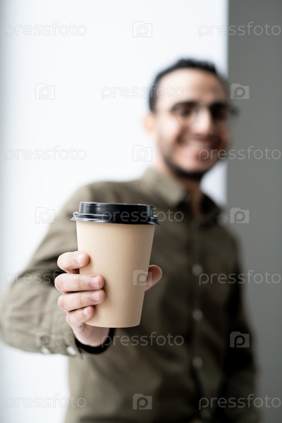 Одноразовый стакан горячего кофе в руке молодого успешного бизнесмена