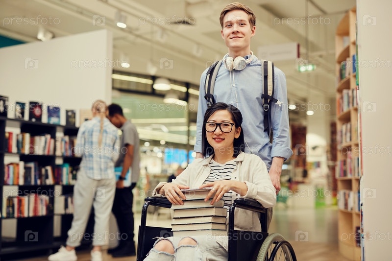 Портрет красивого мальчика с наушниками на шее, помогающего азиатскому товарищу по группе в инвалидном кресле забрать книги из библиотеки