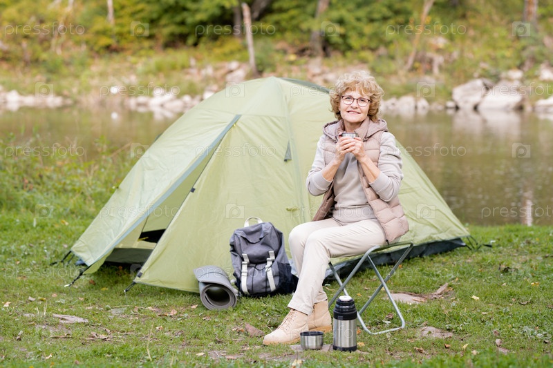 Зрелая улыбающаяся женщина держит горячий напиток, сидя на маленьком туристическом кресле