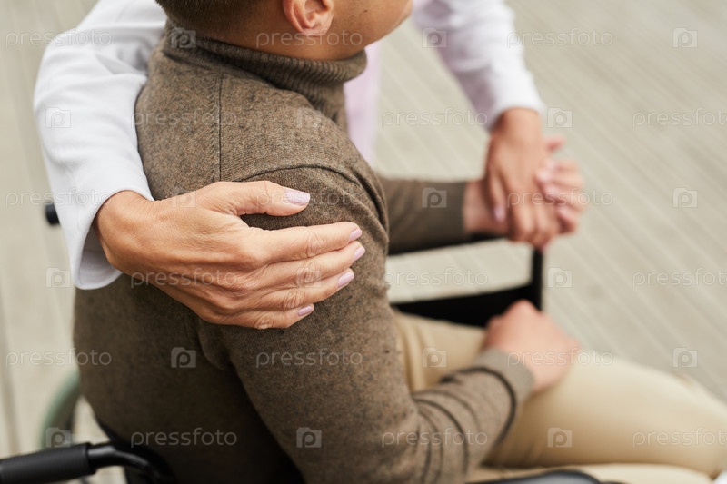 Близкий план неузнаваемого медицинского специалиста, обнимающего плечо пациента, помогая ему встать с инвалидной коляски