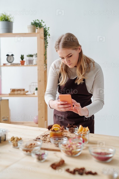 Девушка со смартфоном фотографирует ароматические вещества для изготовления ручного мыла