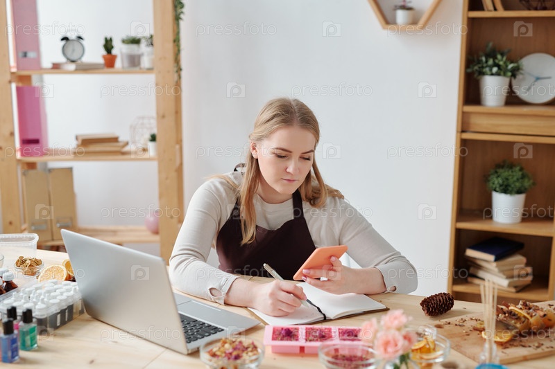 Загруженная молодая женщина со смартфоном прокручивает новые заказы клиентов
