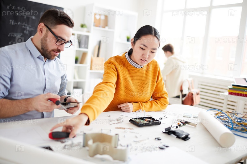 Серьезный молодой азиатский студент сидит за столом со строительным набором и проводами, помогая другу построить робота